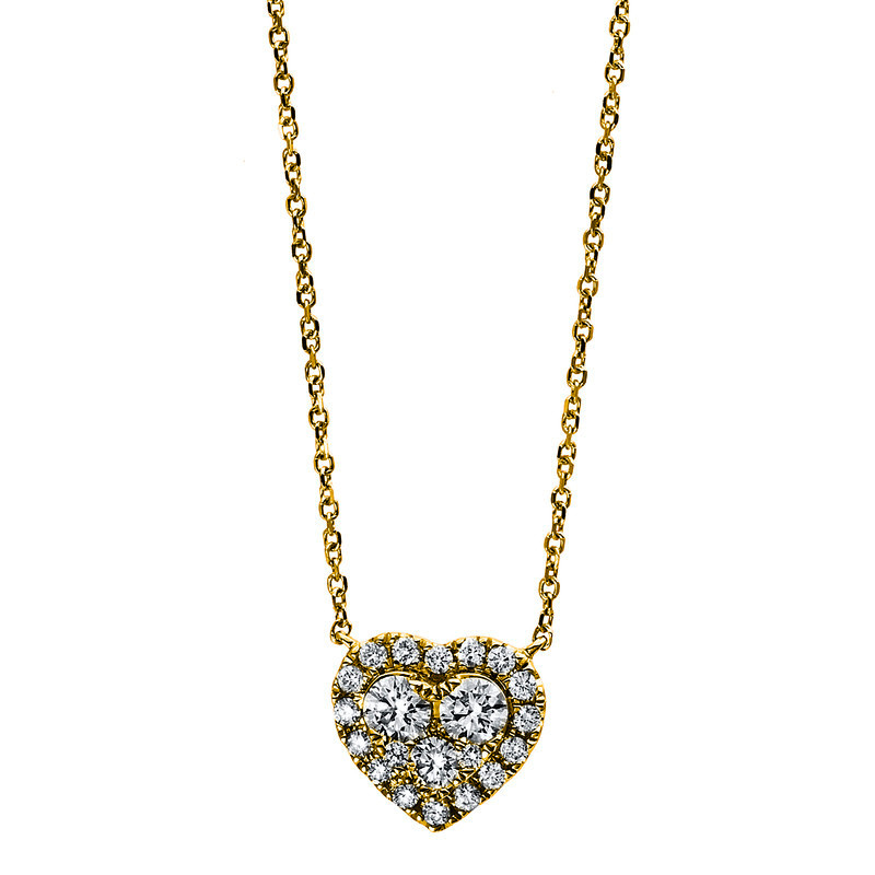 necklace 14 kt YG "heart", 3 diamonds 0,18 ct, G-si, 19 diamonds 0,10 ct, G-si, l:45,0 cm