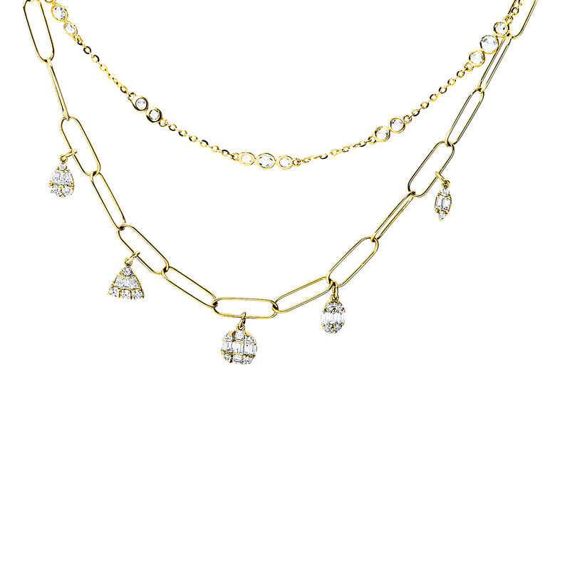necklace 14 kt YG, 20 diamonds 0,27 ct, G-si, 13 rose cut 0,27 ct, G-si, 15 baguette 0,24 ct, G-si, 6 tapers 0,13 ct, G-si, l:45,7 cm