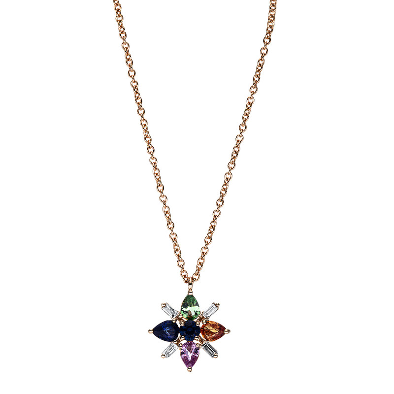 necklace 18 kt RG, with loop, 4 baguette 0,10 ct, G-si, 1 sapphire 0,15 ct pink, 2 sapphire 0,34 ct blue, 1 garnet 0,14 ct green, 1 sapphire 0,18 ct yellow, l:45,7 cm, Ø:12,0 mm