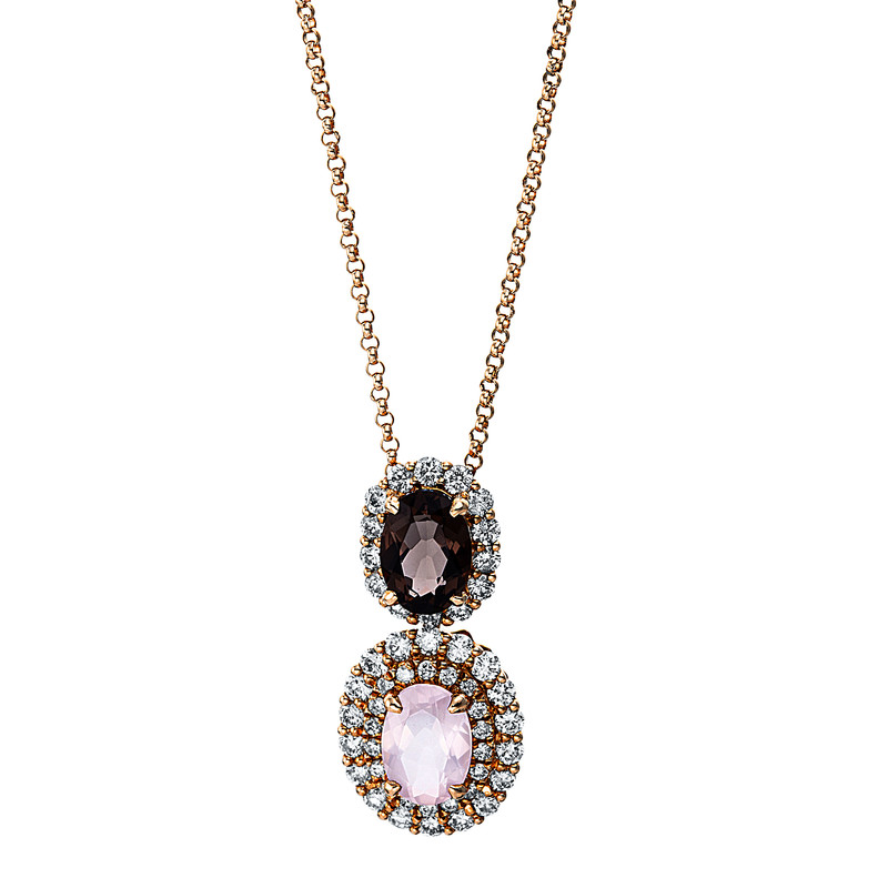 necklace 18 kt RG, 50 diamonds 0,66 ct, G-pi, 1 ros.quartz 0,73 ct, 1 smo.quartz 0,75 ct, l:45,0 cm