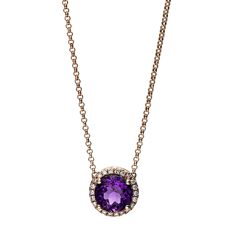 necklace 18 kt RG, 22 diamonds 0,10 ct, G-si, 1 amethyst 1,30 ct, h:9,0 mm, w:9,0 mm, l:43,2 cm