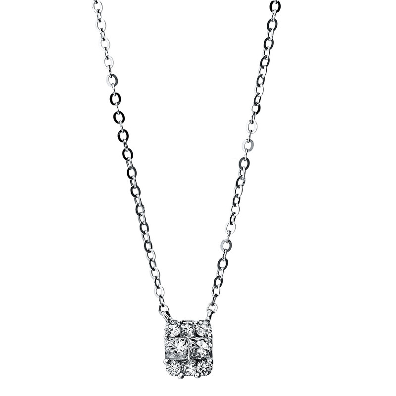 necklace 18 kt WG, with loop at40 cm and 43cm, 4 princess 0,20 ct, G-si, 4 diamonds 0,08 ct, G-si, l:45,7 cm