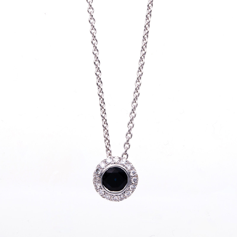 necklace 18 kt WG, 16 diamonds 0,09 ct, G-si, 1 sapphire 0,56 ct blue, h:6,5 mm, w:6,5 mm, l:43,0 cm