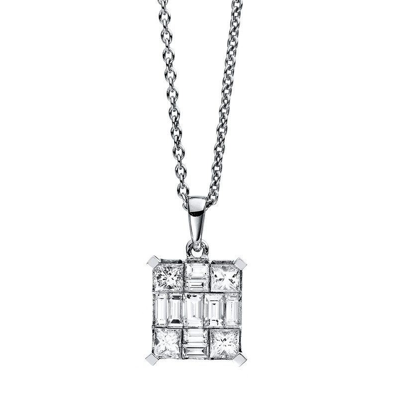 necklace 18 kt WG, 4 princess 0,40 ct, G-si, 9 baguette 0,36 ct, G-si, h:14,1 mm, w:7,6 mm, l:43,0 cm