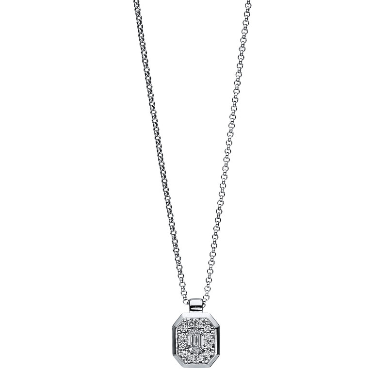 necklace 18 kt WG, 1 em.cut 0,16 ct, G-si, 12 diamonds 0,08 ct, G-si, h:10,8 mm, w:7,4 mm, l:45,0 cm