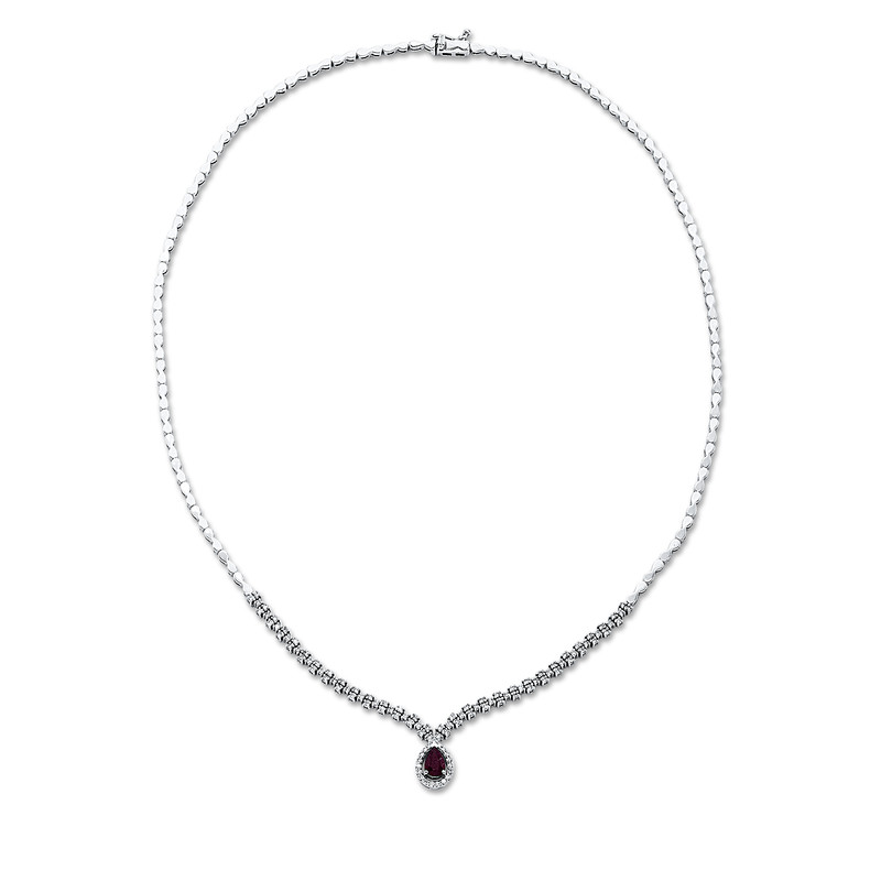 necklace 18 kt WG, 109 diamonds 0,77 ct, G-vsi, 1 ruby 0,57 ct red, l:42,0 cm