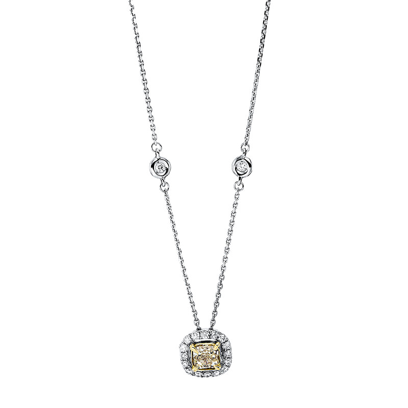 necklace 18 kt WG+YG, 18 diamonds 0,20 ct, G-si, 1 cushion 0,54 ct, yellow, l:42,0 cm