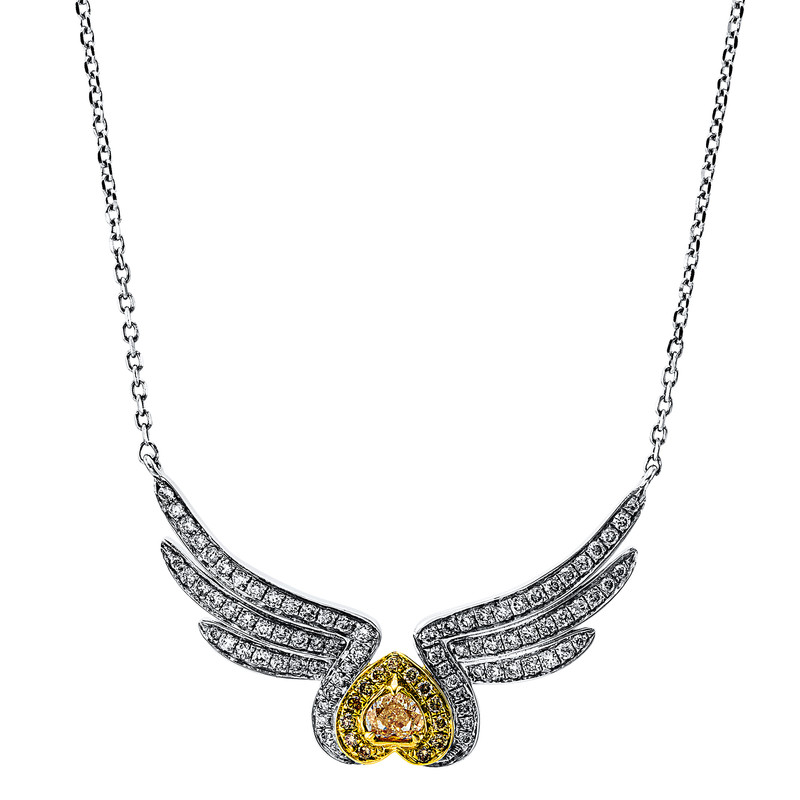 necklace 18 kt WG+YG, 78 diamonds 0,30 ct, G-si, 1 heartshape 0,15 ct, yellow, 13 diamonds 0,05 ct, yellow, l:55,9 cm