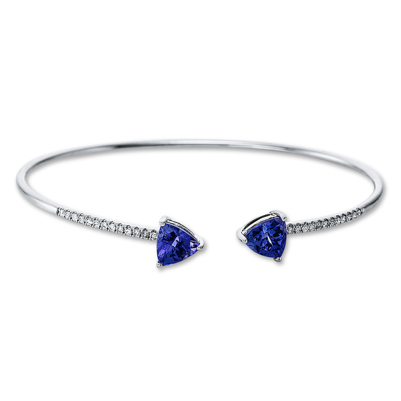 bangle 14 kt WG, 26 diamonds 0,28 ct, G-si, 2 tanzanite 3,02 ct blue, h:50,0 mm, w:60,0 mm