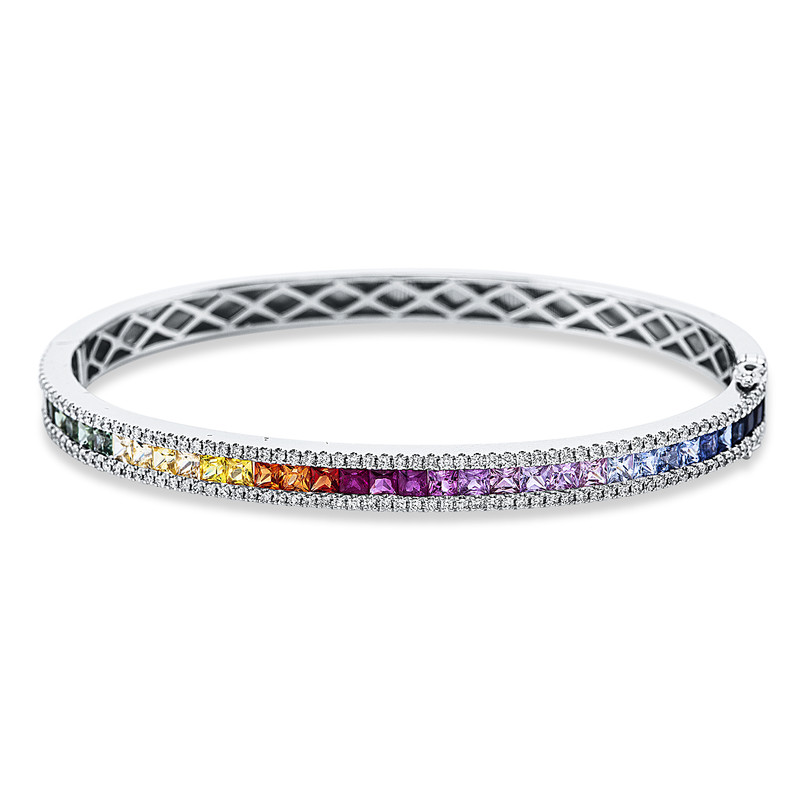 bangle 18 kt WG, 142 diamonds 0,69 ct, G-si, 36 sapphire 3,90 ct multicolor