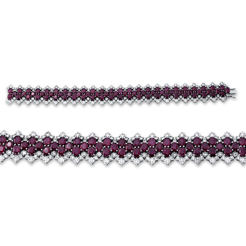 bracelet 18 kt WG, 192 diamonds 11,89 ct, G-si, 72 rubies 33,44 ct red, l:18,4 cm