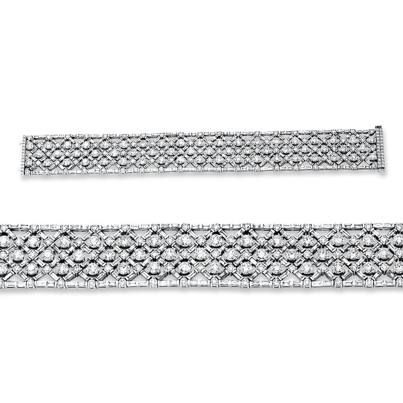 bracelet 18 kt WG, 132 diamonds 6,74 ct, G-si, 56 diamonds 13,70 ct, G-si, 216 baguette 7,19 ct, G-si, l:18,4 cm