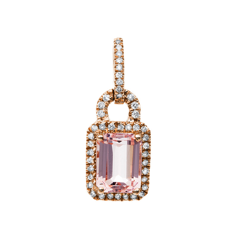 pendant 14 kt RG, with loop, 43 diamonds 0,17 ct, G-si, 1 morganite 1,23 ct rosé