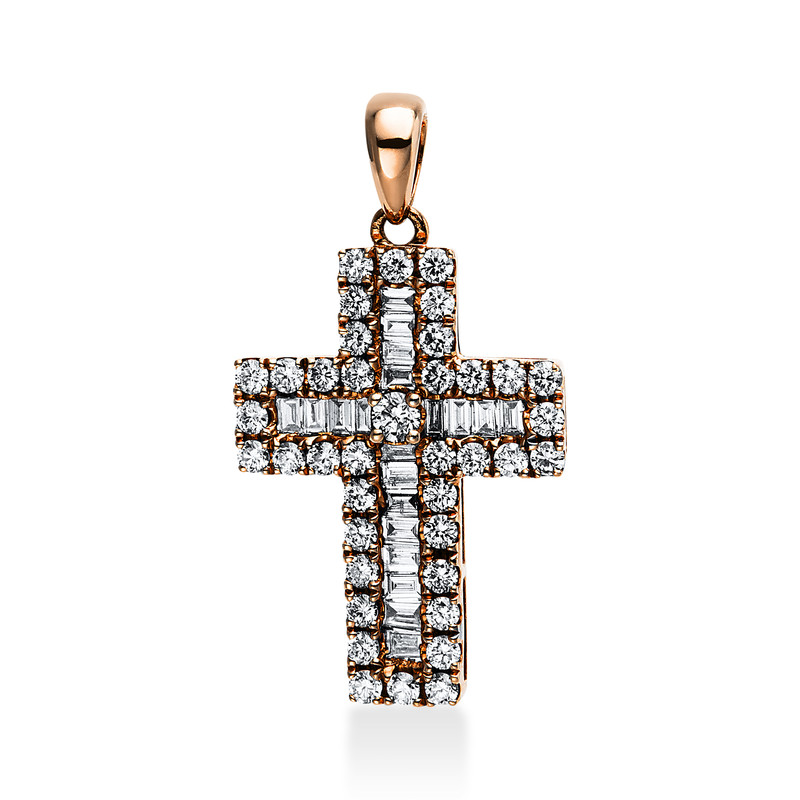 pendant 18 kt RG "cross", with loop, 20 baguette 0,18 ct, G-si, 39 diamonds 0,42 ct, G-si