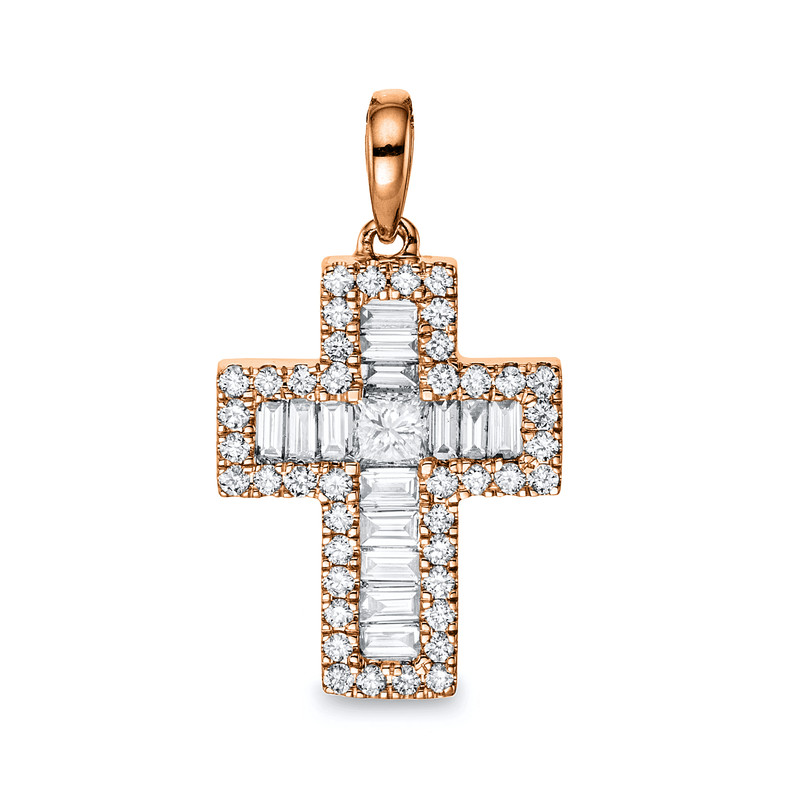 pendant 18 kt RG "cross", with loop, 1 princess 0,09 ct, G-si, 14 tapers 0,23 ct, G-si, 42 diamonds 0,20 ct, G-si