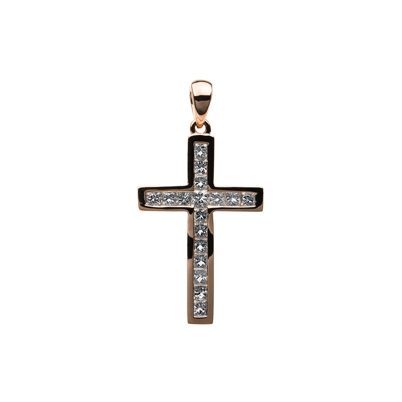 pendant 18 kt RG "cross", 17 princess 0,57 ct, G-si, h:26,5 mm, w:13,5 mm