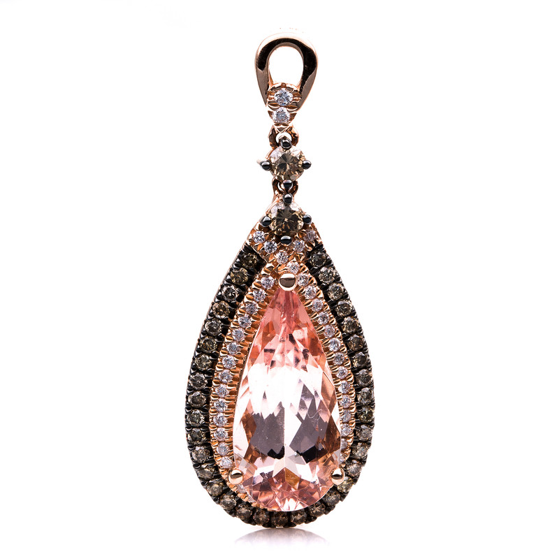 pendant 18 kt RG, 45 diamonds 0,17 ct, G-si, 37 diamonds 0,43 ct, brown, 1 morganite 3,56 ct rosé