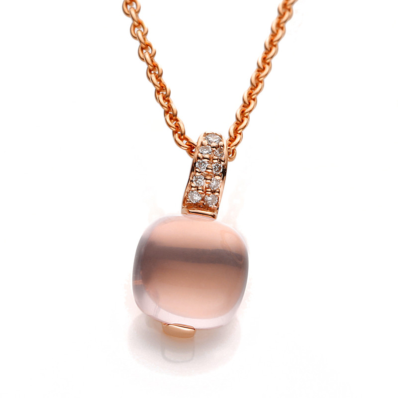 pendant 18 kt RG, 9 diamonds 0,05 ct, G-si, 1 ros.quartz 2,30 ct rosé