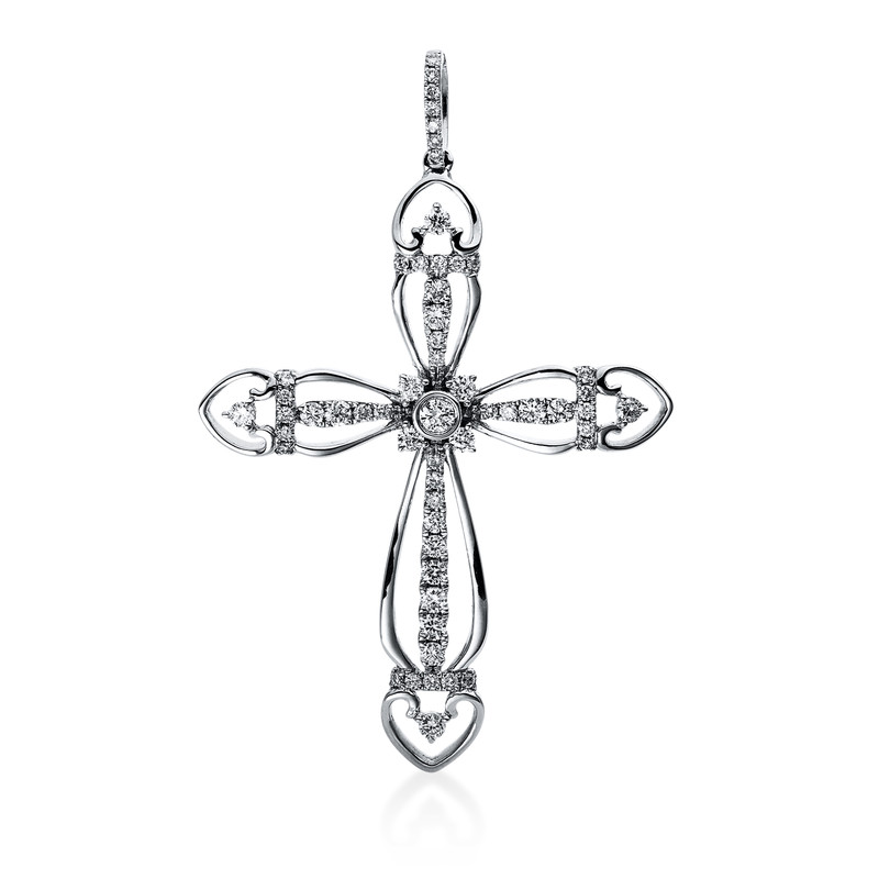 pendant 18 kt WG "cross", with loop, 1 diamond 0,04 ct, G-si, 64 diamonds 0,57 ct, G-si, h:45,0 mm, w:30,0 mm