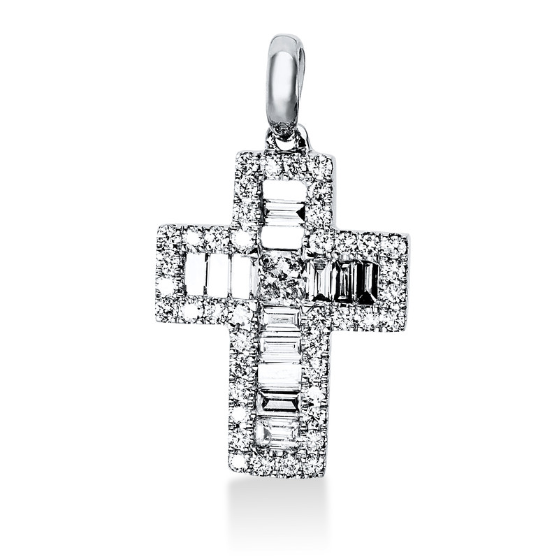 pendant 18 kt WG "cross", with loop, 1 princess 0,09 ct, G-si, 14 tapers 0,22 ct, G-si, 42 diamonds 0,21 ct, G-si, h:20,0 mm, w:11,6 mm