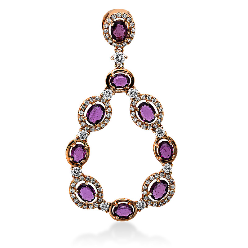 pendant 18 kt WG, with loop, 1 diamond 0,07 ct, G-si, 104 diamonds 0,66 ct, G-si, 9 rodolite 2,06 ct red