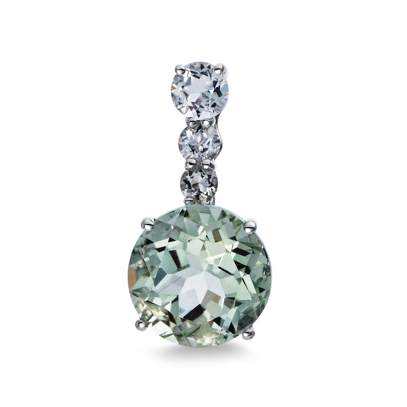 pendant 18 kt WG, 1 amethyst 3,80 ct green, 3 amethysts 0,45 ct green, h:20,3 mm, w:10,3 mm