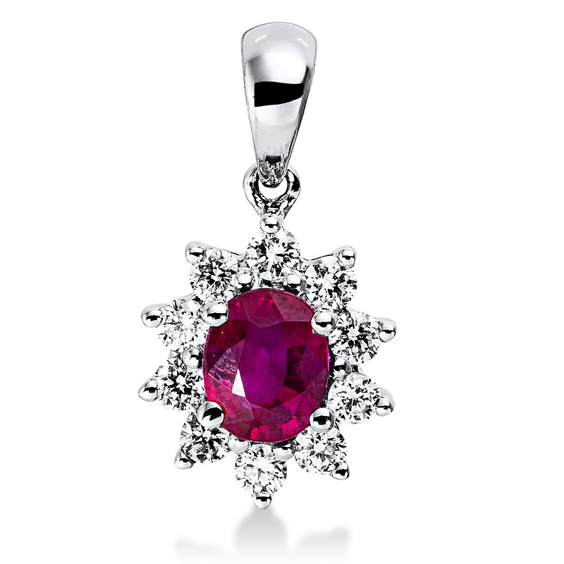 pendant 18 kt WG, 10 diamonds 0,21 ct, G-vsi, 1 ruby 0,47 ct red