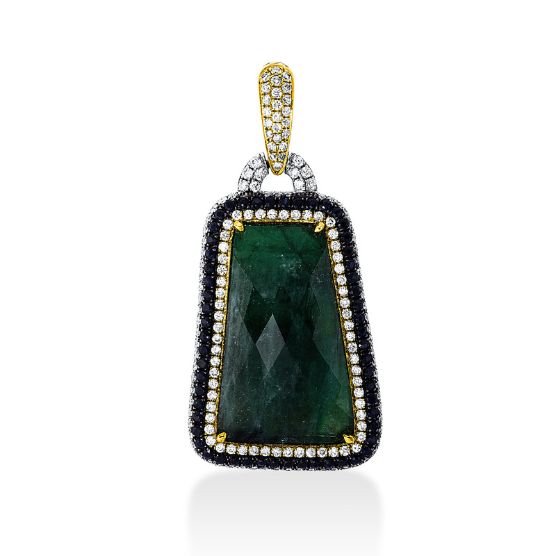 pendant 18 kt WG+YG, setting partly black rhodium, 163 diamonds 1,11 ct, G-si, 57 diamonds 0,84 ct, black, 1 emerald 14,50 ct green
