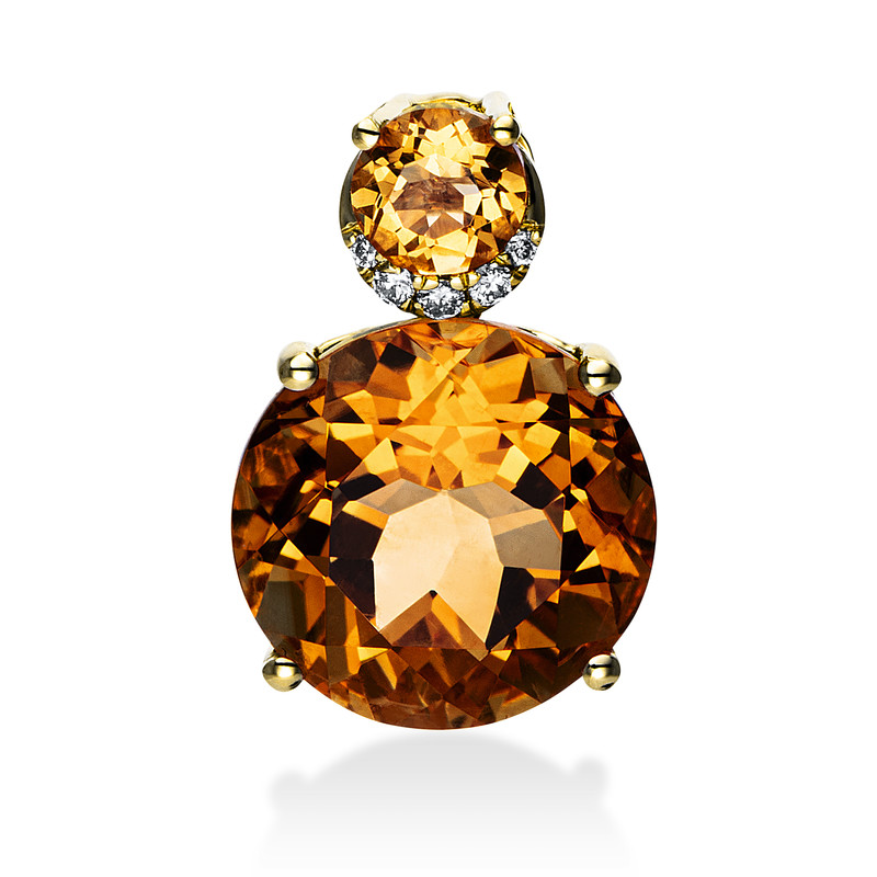 pendant 18 kt YG, 5 diamonds 0,03 ct, G-si, 1 citrine 4,00 ct yellow, 1 citrine 0,30 ct yellow, h:14,8 mm, w:10,1 mm
