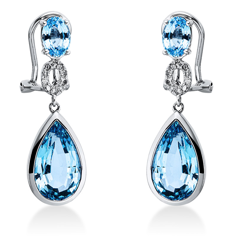 earrings 14 kt WG, 20 diamonds 0,11 ct, G-si, 2 blue topaz 7,78 ct blue, 2 blue topaz 1,49 ct blue