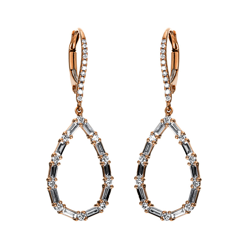 earrings 18 kt RG, 20 diamonds 0,26 ct, G-si, 20 baguette 0,70 ct, G-si, 22 diamonds 0,08 ct, G-si, h:33,2 mm, w:12,4 mm