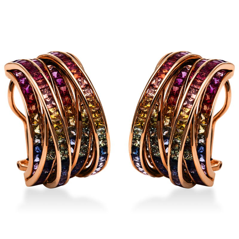 earrings 18 kt RG, 33 rubies 1,81 ct red, 219 sapphire 12,82 ct multicolor