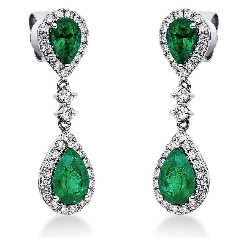 earrings 18 kt WG, IGL 2323953001, 69 diamonds 0,73 ct, G-si, 4 emeralds 2,66 ct green