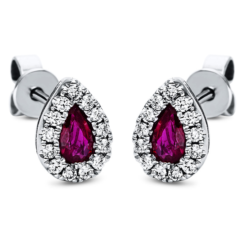 earrings 18 kt WG "pear", 26 diamonds 0,18 ct, G-si, 2 rubies 0,50 ct red, h:8,2 mm, w:5,8 mm