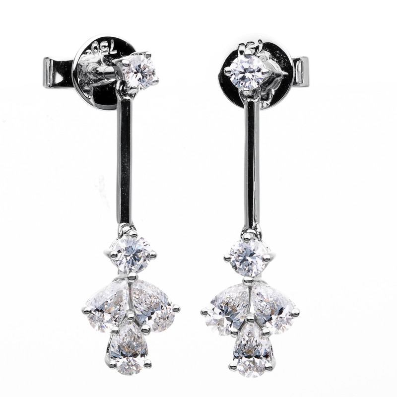 earrings 18 kt WG, 6 pear 0,94 ct, G-vsi/si, 4 diamonds 0,44 ct, G-vsi/si, h:24,0 mm, w:7,7 mm