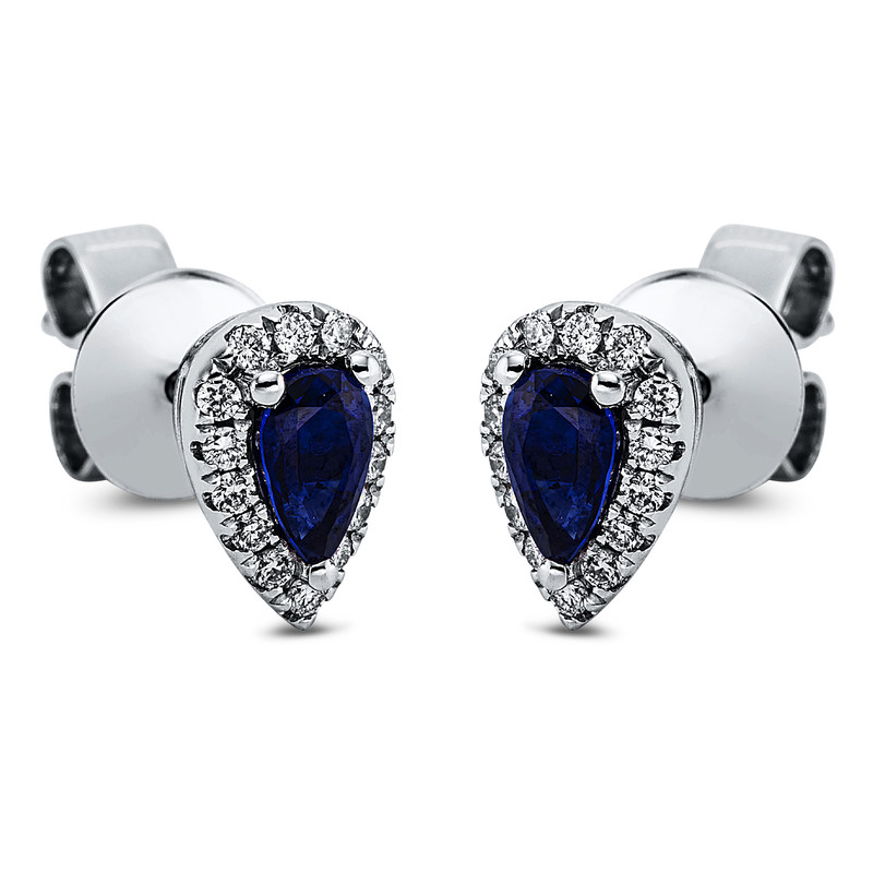 earrings 18 kt WG, 28 diamonds 0,14 ct, G-vsi, 2 sapphire 0,63 ct blue