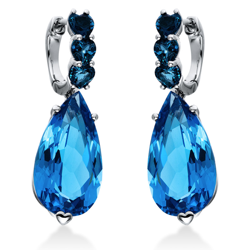 earrings 18 kt WG, 2 blue topaz 16,70 ct blue, 6 blue topaz 1,60 ct Lond. blue, h:31,4 mm, w:10,0 mm