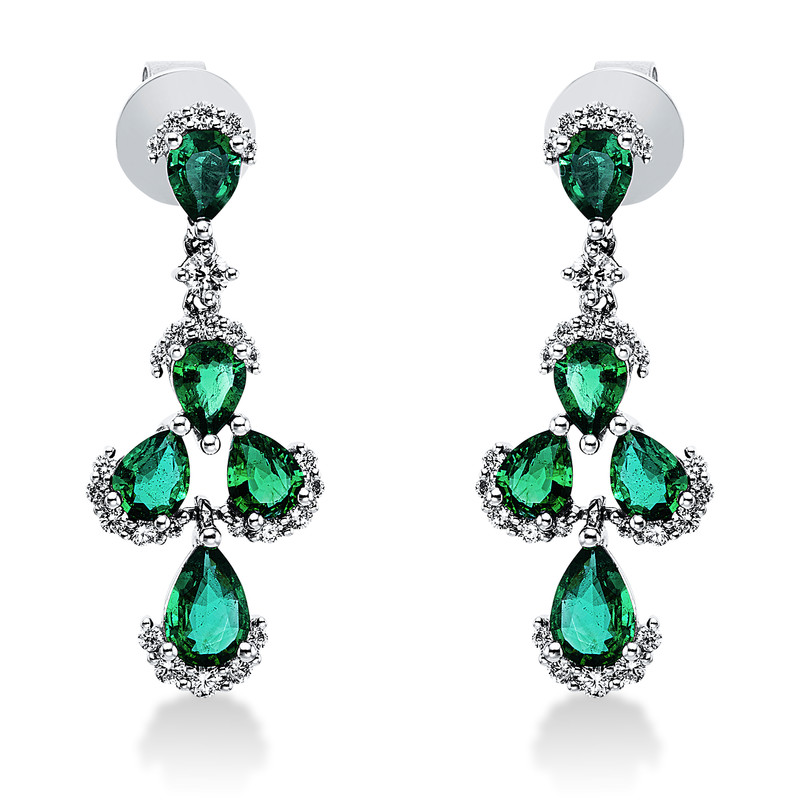 earrings 18 kt WG, 52 diamonds 0,45 ct, G-si, 10 emeralds 1,66 ct green