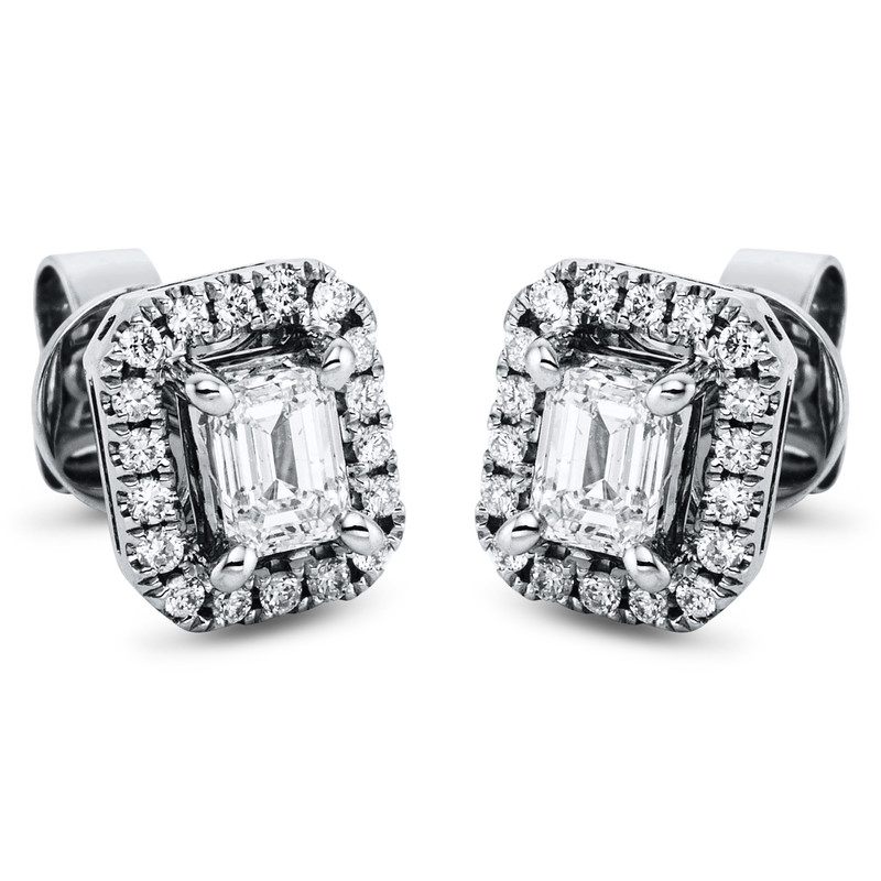earrings 18 kt WG, 2 em.cut 0,48 ct, G-si, 36 diamonds 0,17 ct, G-si