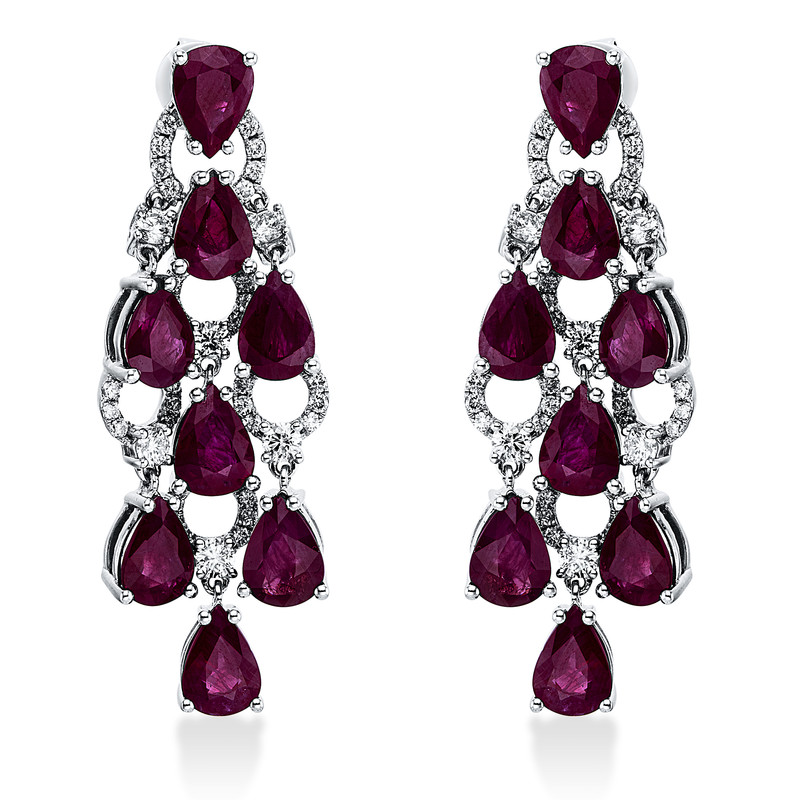 earrings 18 kt WG, 12 diamonds 0,70 ct, H-si, 64 diamonds 0,50 ct, H-si, 16 rubies 12,87 ct red
