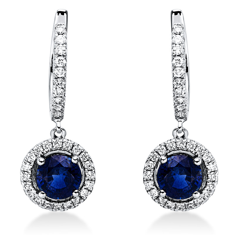 earrings 18 kt WG, 60 diamonds 0,44 ct, G-vsi, 2 sapphire 1,92 ct blue