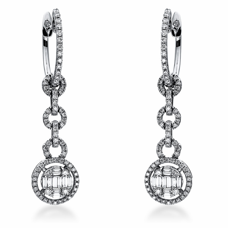 earrings 18 kt WG, 20 baguette 0,25 ct, G-si, 150 diamonds 0,63 ct, G-si