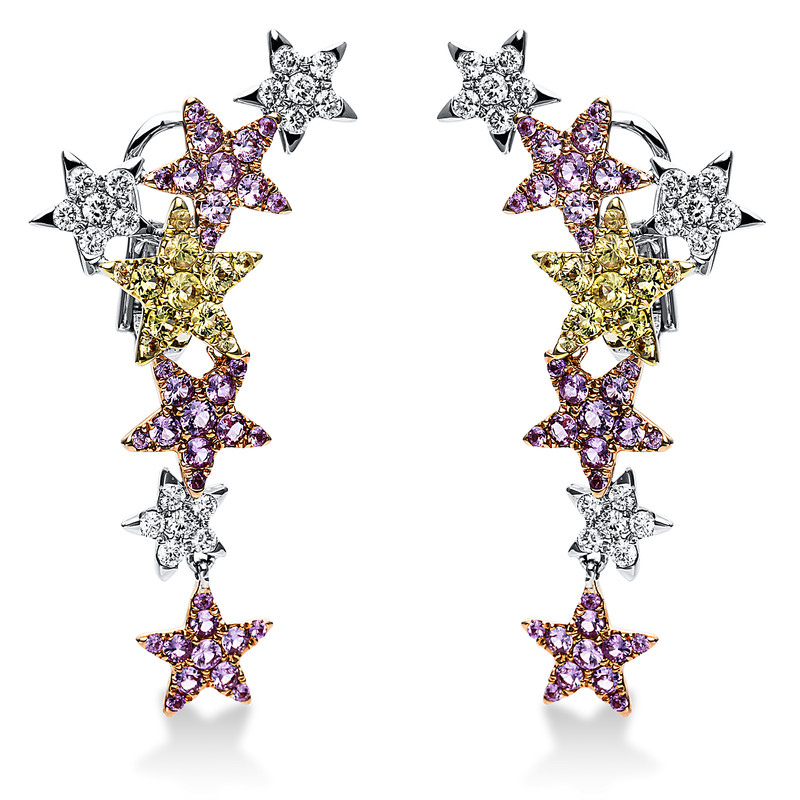 earrings 18 kt WG+YG+RG "star", 36 diamonds 1,02 ct, G-vsi, 22 sapphire 0,98 ct yellow, 66 sapphire 2,17 ct pink