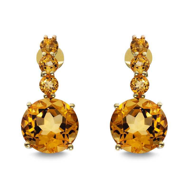 earrings 18 kt YG, 2 citrine 5,10 ct yellow, 6 citrine 0,60 ct yellow, h:19,3 mm, w:9,2 mm