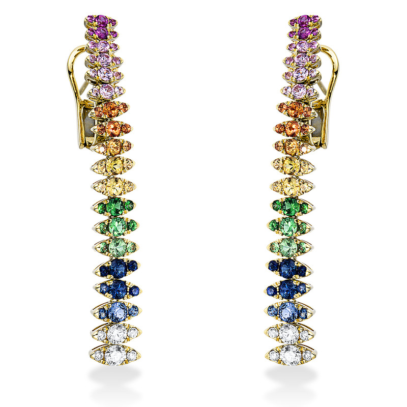 earrings 18 kt YG, 12 diamonds 0,63 ct, G-vsi/si, 102 sapphire 3,95 ct multicolor