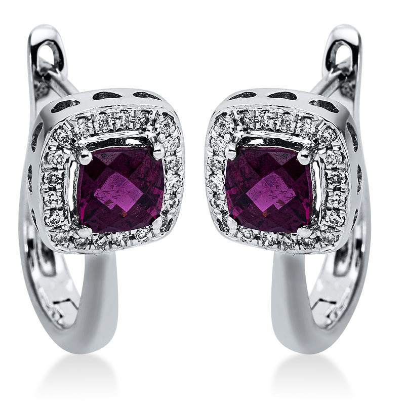 huggies 14 kt WG, 40 diamonds 0,11 ct, G-si, 2 rodolite 0,66 ct red