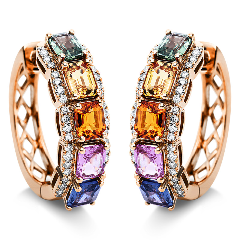 huggies 18 kt RG, 80 diamonds 0,52 ct, G-si, 10 sapphire 5,21 ct multicolor