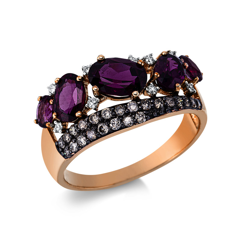ring 14 kt RG, setting partly black rhodium, 9 diamonds 0,09 ct, G-si, 23 diamonds 0,29 ct, brown, 5 rodolite 2,91 ct red, width:57