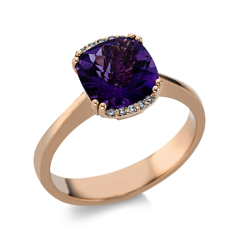 ring 14 kt RG, 10 diamonds 0,05 ct, G-vsi, 1 amethyst 1,90 ct lilac, width:53