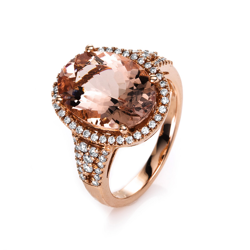 ring 14 kt RG, 68 diamonds 0,42 ct, G-si, 1 morganite 5,74 ct rosé, h:16,3 mm, w:13,4 mm, width:55